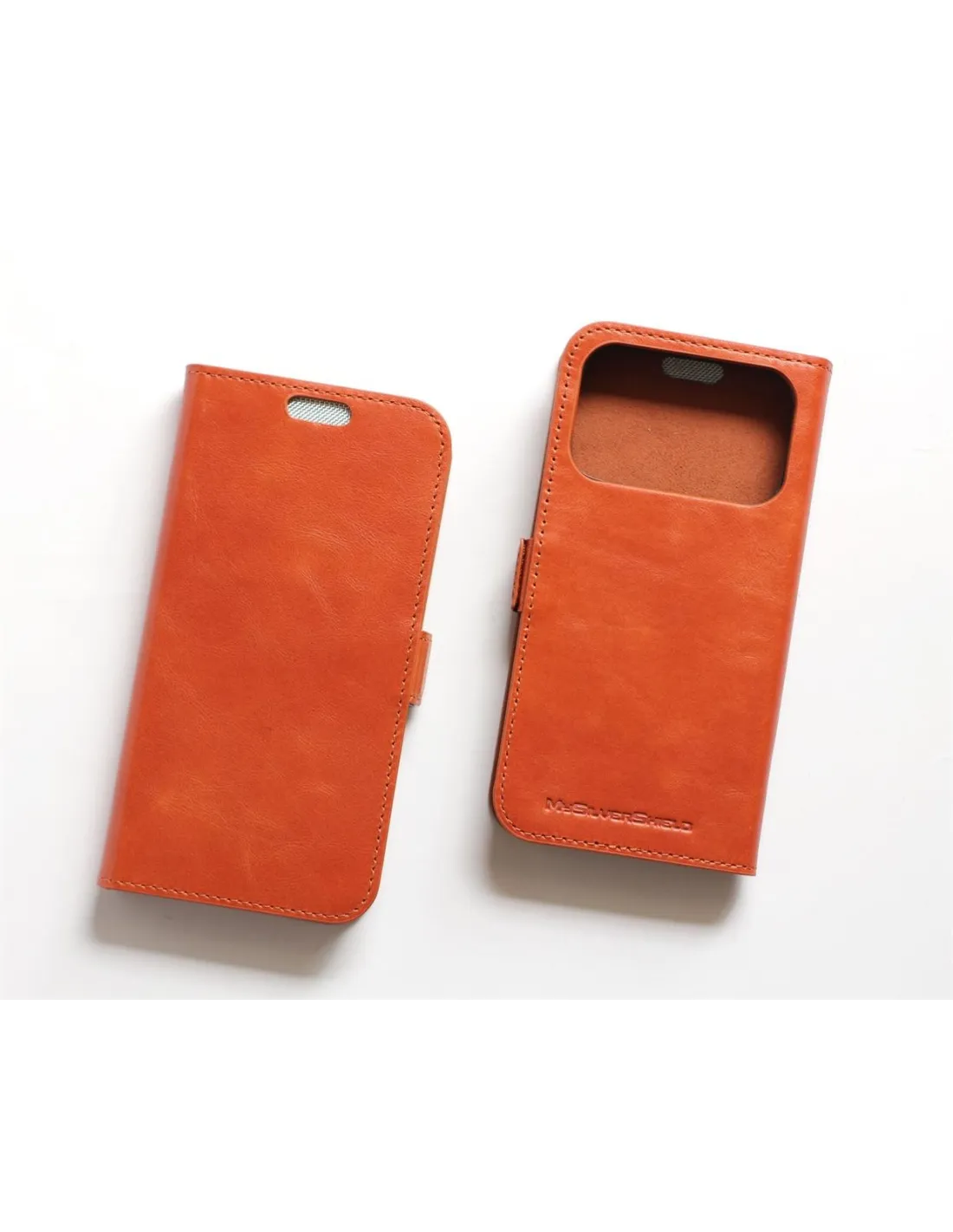 Fabricada en cuero de flor entera color miel, destaca por su tono cálido y natural, su textura suave y su resistencia. Cada funda es el resultado de un acabado artesanal de calidad superior.