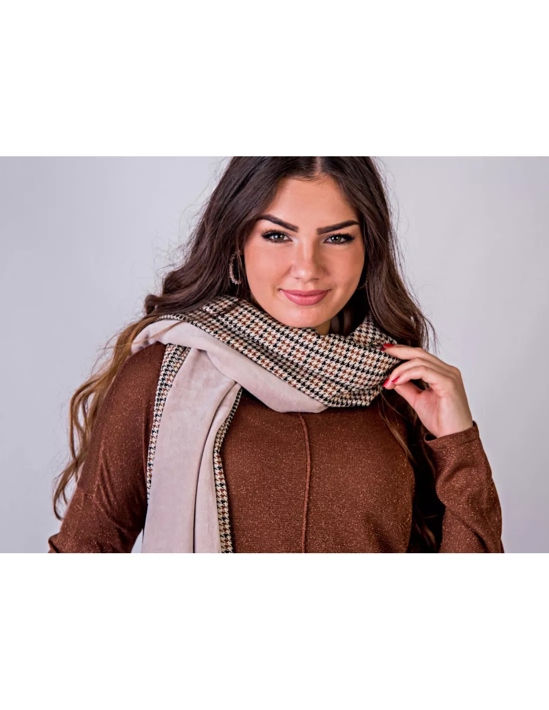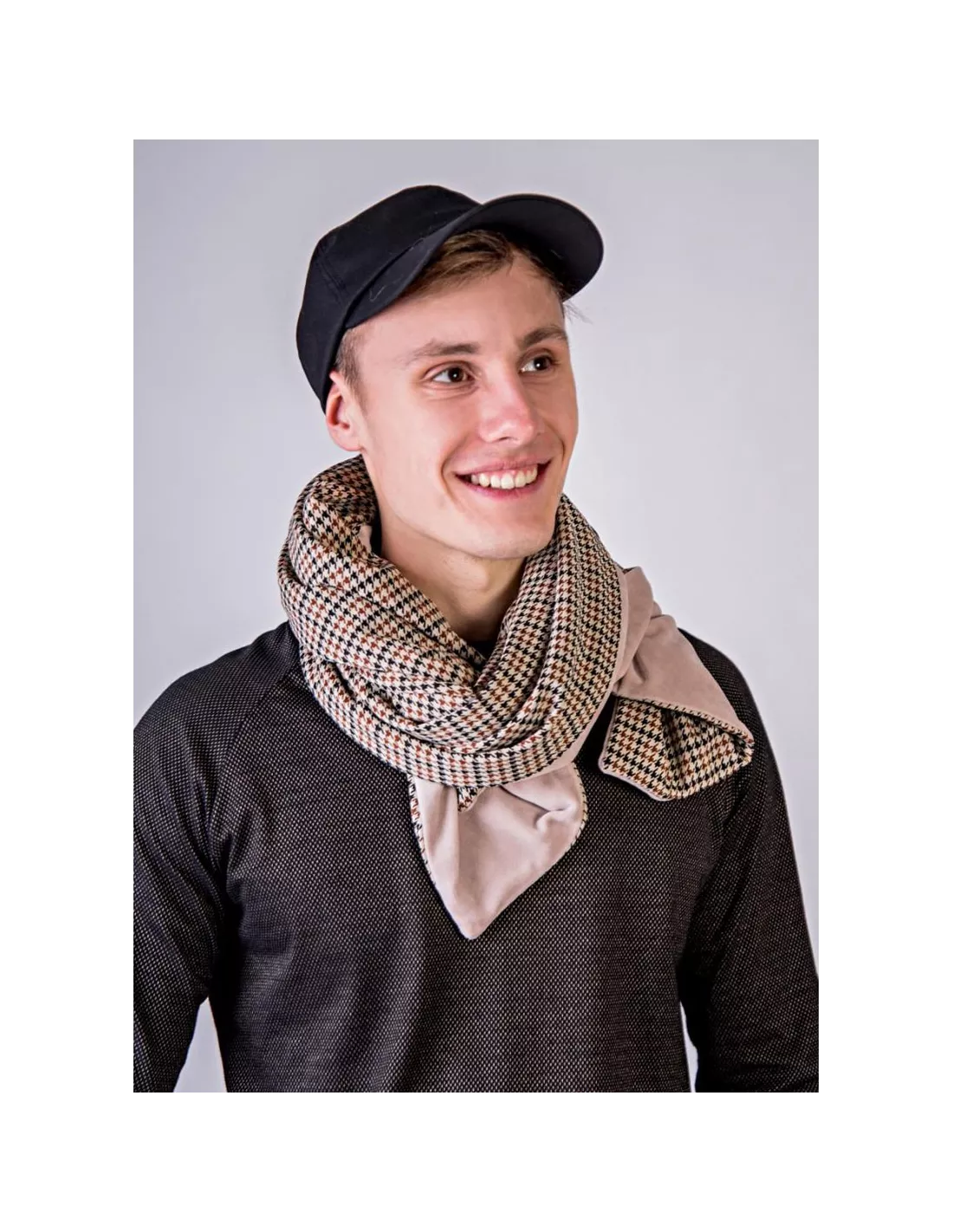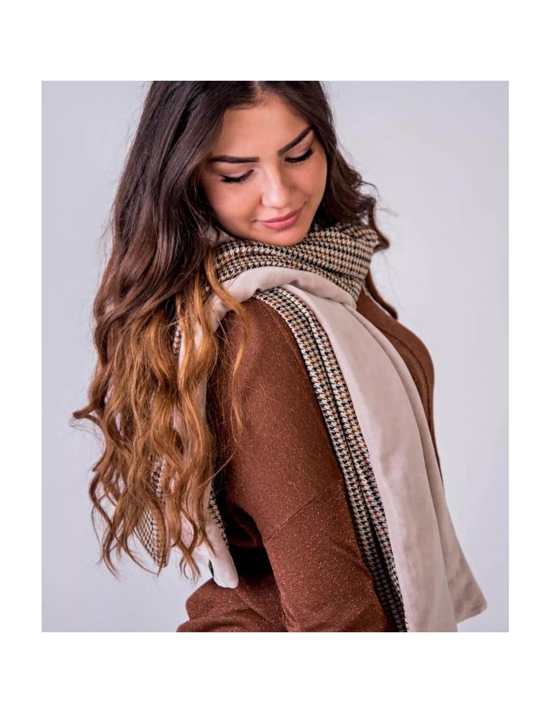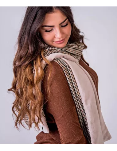 La sciarpa è un accessorio moda essenziale in ogni guardaroba. Ci avvolgiamo nella nostra sciarpa per proteggerci con stile dagli elementi. Per la stagione autunno-inverno 2020/2021, la stampa a quadri è un must-have della moda. Per questo motivo, vi presentiamo il nostro nuovo modello... che può essere indossato sia da donne che da uomini. Questa sciarpa double-face è realizzata in jersey pied de poule color cammello su un lato. L'altro lato è in cotone nicky beige abbinato, che conferisce alla sciarpa un tocco ancora più morbido. Naturalmente, è anche foderata con un tessuto schermante che blocca le alte frequenze in modo molto efficace. La sciarpa misura circa 145 cm di lunghezza e 35 cm di larghezza.