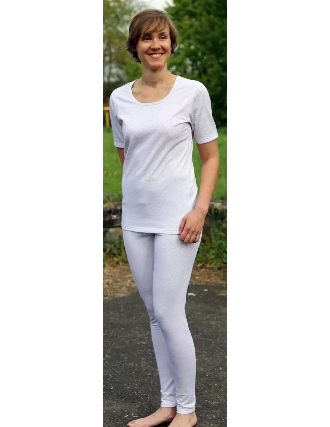 Questa t-shirt da donna è realizzata in tessuto di cotone e contiene fibre d'argento. Queste offrono proprietà schermanti contro le radiazioni ad alta frequenza.